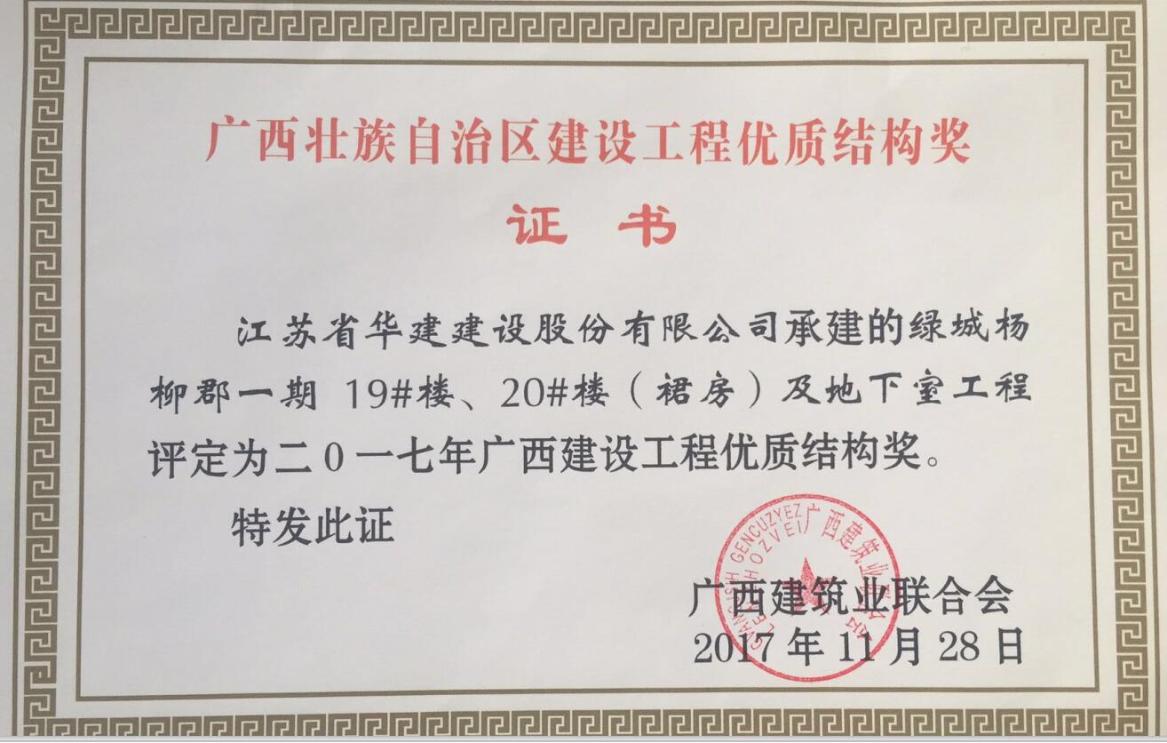 近期從廣西建筑業(yè)聯(lián)合會(huì)獲悉,我公司總承包施工的廣西自治區(qū)柳州市“綠城楊柳郡一期19#、20#樓(裙房)及地下室工程”和“綠城楊柳郡一期15#樓及地下室工程”兩項(xiàng)工程被評(píng)定為二0一七年廣西建設(shè)工程優(yōu)質(zhì)結(jié)構(gòu)獎(jiǎng),這也是北京區(qū)域公司在廣西自治區(qū)獲獎(jiǎng)的第一個(gè)項(xiàng)目。