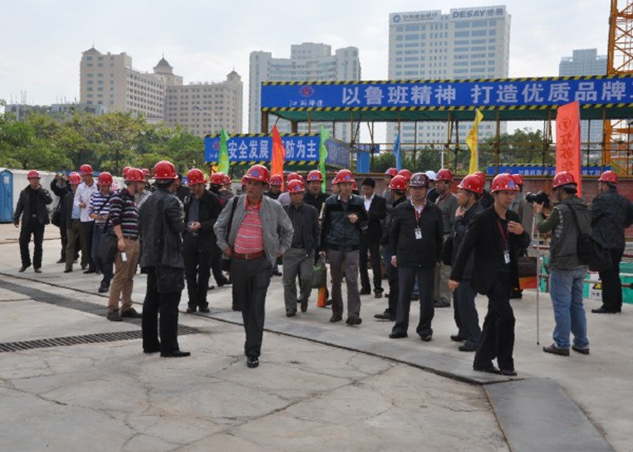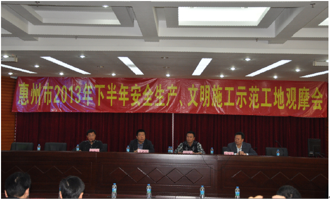 2013年11月27日上午,“廣東省房屋市政工程安全生產(chǎn)文明施工示范工地”示評會在惠州公司大隆·財富廣場項目工地現(xiàn)場召開。廣東省住房和城鄉(xiāng)建設(shè)廳質(zhì)量安全監(jiān)管處調(diào)研員彭雞寶、廣東省建筑安全協(xié)會會長鐘偉文、惠州市住房和城鄉(xiāng)規(guī)劃建設(shè)局副局長陳訓(xùn)政、惠城區(qū)城鄉(xiāng)規(guī)劃建設(shè)局副局長月明應(yīng)邀出席了本次會議,一同參加會議的還有擔(dān)任本次評審工作的30位評審專家。會議由廣東省建筑安全協(xié)會副秘書長王啟主持。