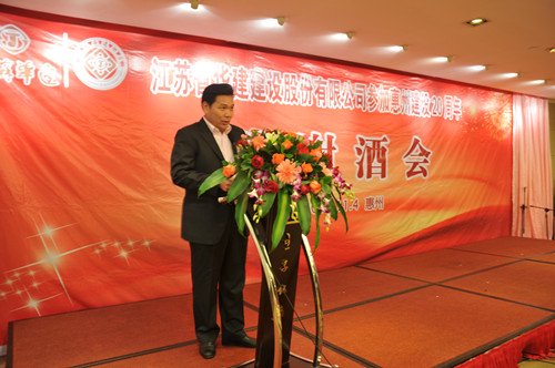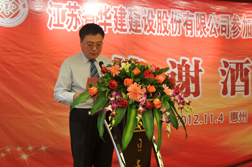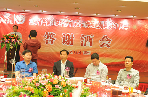 11月4日,公司在惠州隆重舉辦參加惠州建設(shè)20周年答謝酒會(huì),副董事長、總經(jīng)理宗有農(nóng)主持并作開場致辭。惠州市有關(guān)政府部門、部分合作方企業(yè)的負(fù)責(zé)人,華建聯(lián)盟成員單位負(fù)責(zé)人,公司董事、監(jiān)事和高管等130余人出席酒會(huì)。惠州公司總經(jīng)理華恒榮介紹了公司參加惠州建設(shè)二十年的有關(guān)情況。惠州市工商聯(lián)主席、恒宇實(shí)業(yè)發(fā)展公司董事長楊滿芳代表合作方發(fā)言,惠州市住房和城鄉(xiāng)規(guī)劃建設(shè)局副局長陳訓(xùn)政代表政府主管部門致辭,分別對江蘇華建進(jìn)惠施工二十周年表示祝賀。公司董事長陸金龍代表總部對惠州市有關(guān)政府部門、相關(guān)合作方和社會(huì)各界人士給予公司的關(guān)心和支持表示誠摯的感謝,并表達(dá)了進(jìn)一步加大支持力度、加強(qiáng)戰(zhàn)略合作、加快科學(xué)發(fā)展的意愿。