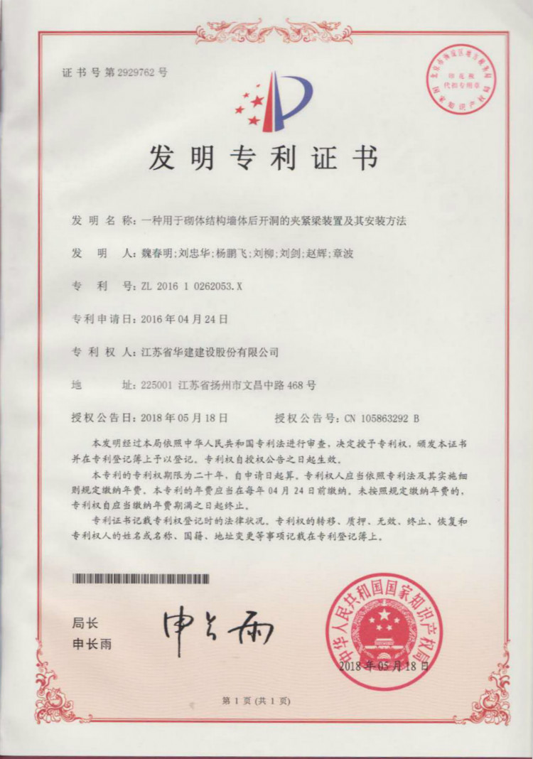江蘇華建再獲1項發明專利、3項實用新型專利 時間:2018-06-07 3200 日前,從國家知識產權局傳來喜訊,江蘇華建發布的《一種用于砌體結構墻體后開洞的夾緊梁裝置及其施工方法》獲得發明專利授權(專利號:ZL201610262053.X),《一種建筑板材角磨機》(專利號:ZL201720592798.2)、《一種建筑施工用鋼筋切斷機》(專利號:ZL201720593659.1)、《一種建筑施工用混凝土攪拌機》(專利號:ZL201720593516.0)獲得實用新型專利授權。