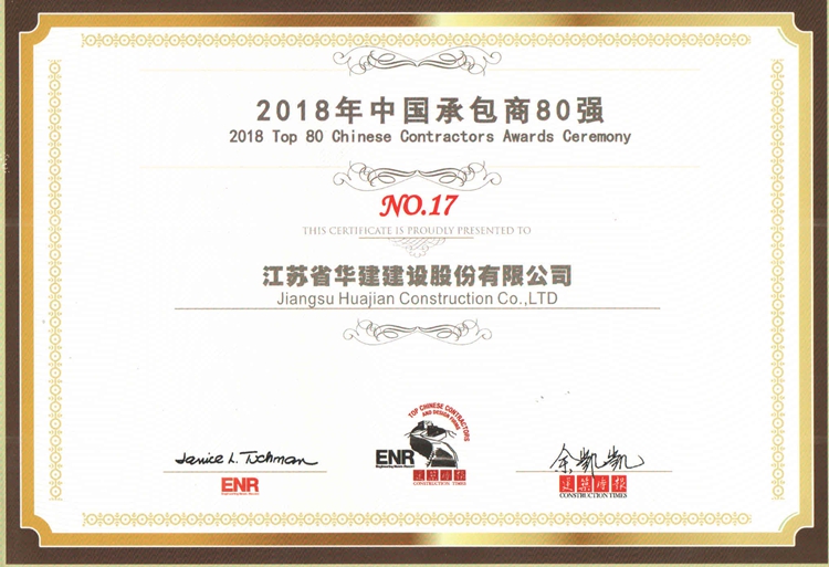 11月8日,由美國《工程新聞記錄》(簡稱ENR)和中國《建筑時報》主辦的2018年“中國承包商80強和工程設計企業60強”排名正式揭曉,江蘇華建再次入選中國承包商80強榜單,列第17位。