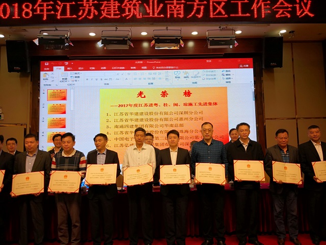 3月24日上午,江蘇省人民政府駐深圳(廣州)辦事處和江蘇省住房和城鄉建設廳在廣東深圳召開2017年度江蘇建筑業南方區工作會議。會上,珠海公司被江蘇省住房和城鄉建設廳表彰為2017年度江蘇出省施工先進集體, 珠海分公司總經理呂方達、陽江分公司副總經理余新江榮獲“出省施工先進個人”稱號。