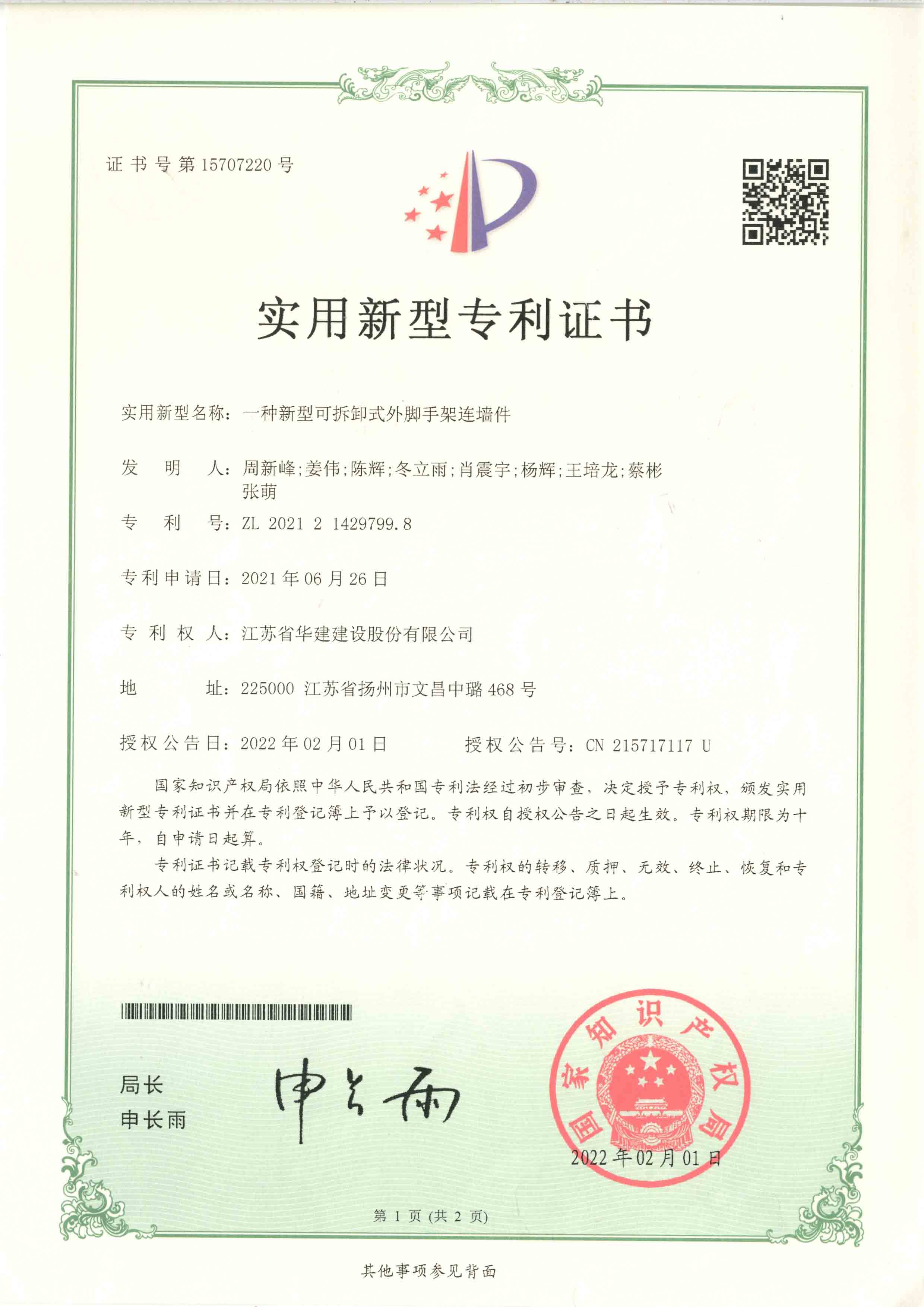 北京分公司2022年度已取得兩項實用新型專利證書 時間:2022-08-22 4030 日前,國家知識產權局頒發了實用新型專利證書,公司兩項專利取得實用新型專利證書,分別是:一種新型可拆卸式外腳手架連墻件、一種鋼筋混凝土現澆板板厚高精度控制裝置。