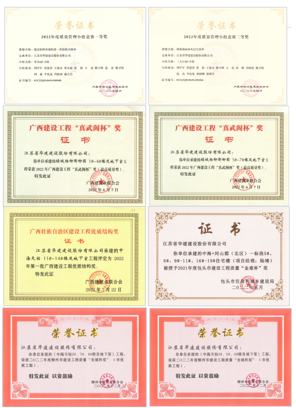 2022年度,北京分公司技術成果和質量創優表現非常突出。截至目前,技術成果方面共獲得七項國家獎項和八項省級獎勵,質量創優方面,共獲得兩項省級優質工程、兩項省級優質結構和市優質工程三項。具體而言,BIM成果共獲兩項國家獎項,QC成果獲一項國家獎項及七項省級獎項,申請專利獲得四項國家實用新型專利授權,新技術應用示范工程獲一項省級獎項,項目工程方面綠城楊柳郡柳園1#-4#及地下室工程和綠城楊柳郡柳園5#-7#及地下室工程分獲廣西建設工程“真武閣杯”獎(最高質量獎),中海天鉆11#-14#及地下室工程和楊柳郡華園1-7#樓及地下室分獲廣西建設工程優質結構獎,中海天鉆3#、5#、6#樓及地下室和中海天鉆2#、7#、8#樓及地下室分獲柳州市建設工程“龍城杯獎”,中海河山郡(北區)一標段5#、6#、9#-11#、16#-19#住宅樓獲包頭市建設工程質量“金鹿杯”獎。