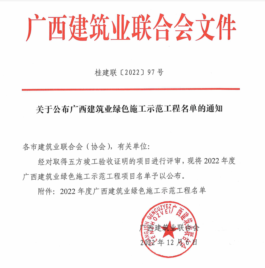 北京分公司兩項工程獲廣西建筑業綠色施工示范工程安全創優獎項 時間:2022-12-30 2225 近日,從廣西建筑業聯合會傳來喜訊,由北京公司總包承建的楊柳郡柳園1#、2#、3#、4#樓及地下室項目和楊柳郡柳園5#、6#、7#及地下室項目榮獲“2022年度廣西建筑業綠色施工示范工程”光榮稱號。